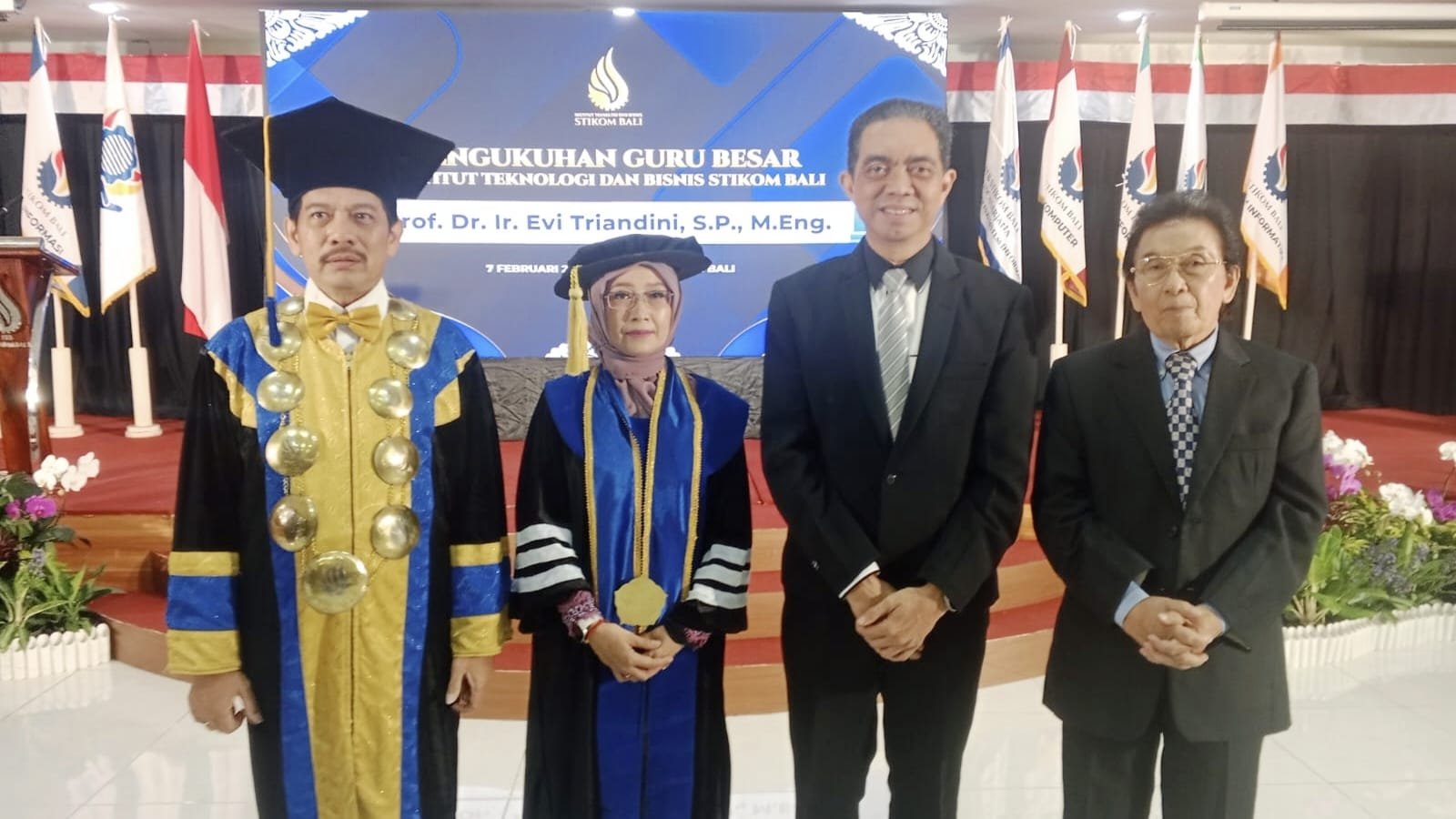 “Sekaligus, menurut pengamatan saya, Prof Evi menjadi Profesor pertama bidang IT di PTS yang ada di Bali,” tambahnya. Dalam orasi ilmiahnya, Evi Triandini memaparkan, penelitian yang dilakukan menjembatani kebutuhan penyandang disabilitas melalui alat prostetis dan teknologi informasi untuk kemandirian pasien.