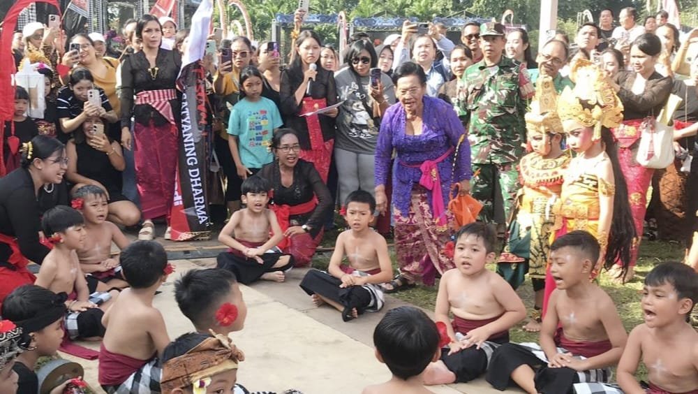DENPASAR, MataDewata.com | Di tengah riuhnya pagelaran seni dalam rangkaian Kasanga Festival di Lapangan Puputan Badung I Gusti Ngurah Made Agung, Minggu (8/3/2026), sosok A.A. Istri Rai Setyawati, SST., tampak berdiri di antara anak-anak yang bersiap tampil. Dengan tatapan lembut namun penuh ketegasan, perempuan berusia 73 tahun itu membimbing gerak demi gerak, memastikan setiap anak menari dengan percaya diri.