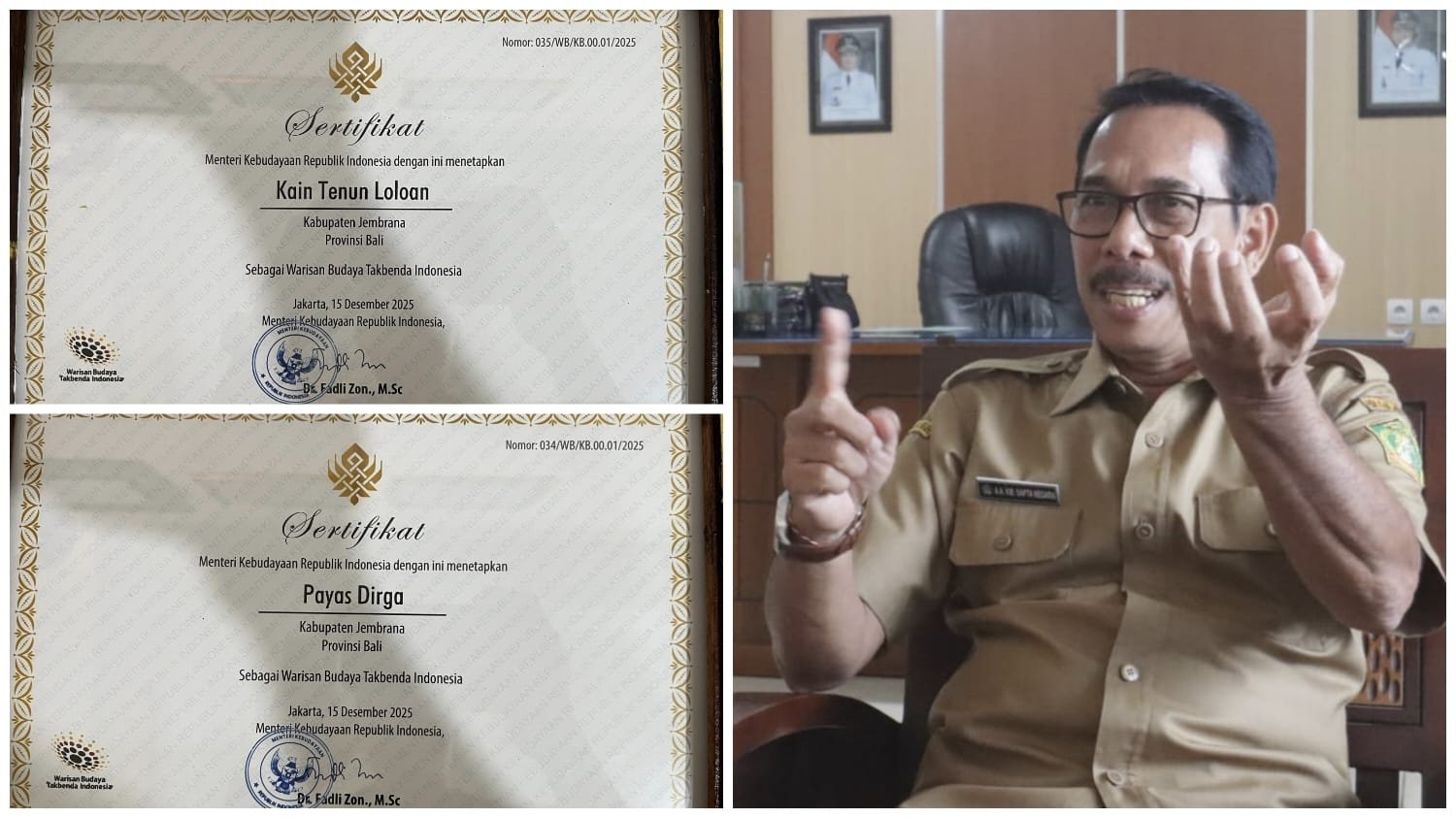 JEMBRANA, MataDewata.com | Kekayaan budaya Kabupaten Jembrana kembali mendapat pengakuan di tingkat nasional. Dua karya budaya khas Bumi Makepung, yakni busana pengantin Payas Dirga dan Kain Tenun Loloan, resmi ditetapkan sebagai Warisan Budaya Tak Benda (WBTB) Indonesia tahun 2025 oleh Kementerian Kebudayaan Republik Indonesia.