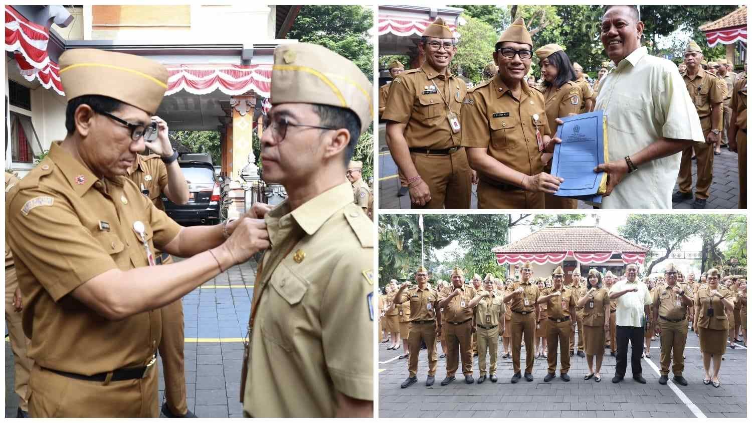 DENPASAR, MataDewata.com | Sekretaris Daerah Kota Denpasar, I Gusti Ngurah Eddy Mulya menyematan atribut pin Zona Integritas (ZI) Wilayah Birokrasi Bersih dan Melayani (WBBM) kepada Aparatur Sipil Negara (ASN) saat memimpin Apel Disiplin di lingkungan Kantor Badan Pendapatan Daerah (Bapenda) Kota Denpasar, Senin (9/3/2026).