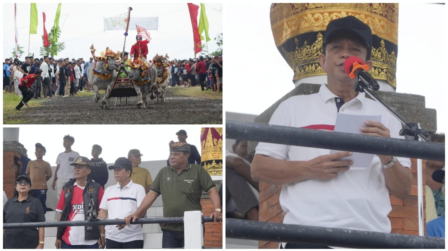 JEMBRANA, MataDewata.com | Lomba Makepung Bupati Cup 2025 yang digelar di Sirkuit All in One Desa Pengambengan, Minggu (9/11/2025), berlangsung meriah. Ribuan masyarakat tampak memadati arena untuk menyaksikan tradisi balapan kerbau khas Jembrana itu. Perlombaan ini secara resmi dilepas oleh Asisten Pemerintahan dan Kesejahteraan Rakyat Kabupaten Jembrana, I Ketut Armita, mewakili Bupati Jembrana.