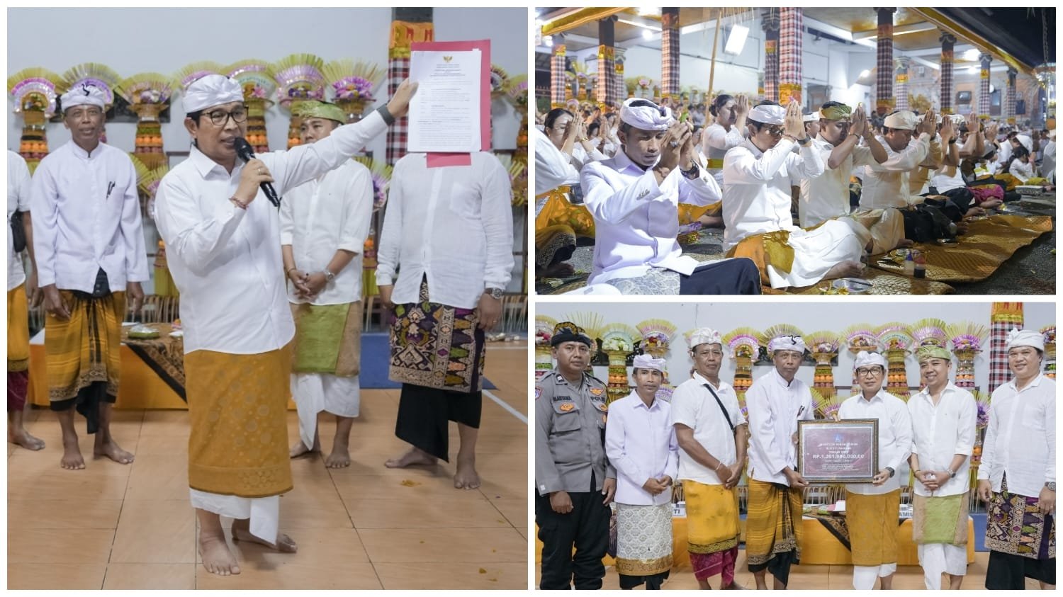 BADUNG, MataDewata.com | Bupati Badung, I Wayan Adi Arnawa menghadiri Karya Nyatur Padudusan Alit di Pura Ulun Siwi, sekaligus menyerahkan bantuan hibah tanah, hibah perubahan tahun 2025 sebesar Rp1,2 miliar lebih dan punia sebesar Rp20 juta kepada Banjar Kedampal, Kamis (9/10/2025) di Pura Ulun Siwi, Banjar Kedampal, Desa Abiansemal Dauh Yeh Cani, Kecamatan Abiansemal, Badung. Turut mendampingi Anggota DPRD Badung, I Putu Dendy Astra Wijaya; Camat Abiansemal IB. Putu Mas Arimbawa serta Tripika Kecamatan Abiansemal, Perbekel Desa Dauh Yeh Cani I Made Budiana, Prajuru Adat dan Dinas Desa Abiansemal Dauh Yeh Cani, Tokoh serta masyarakat setempat.