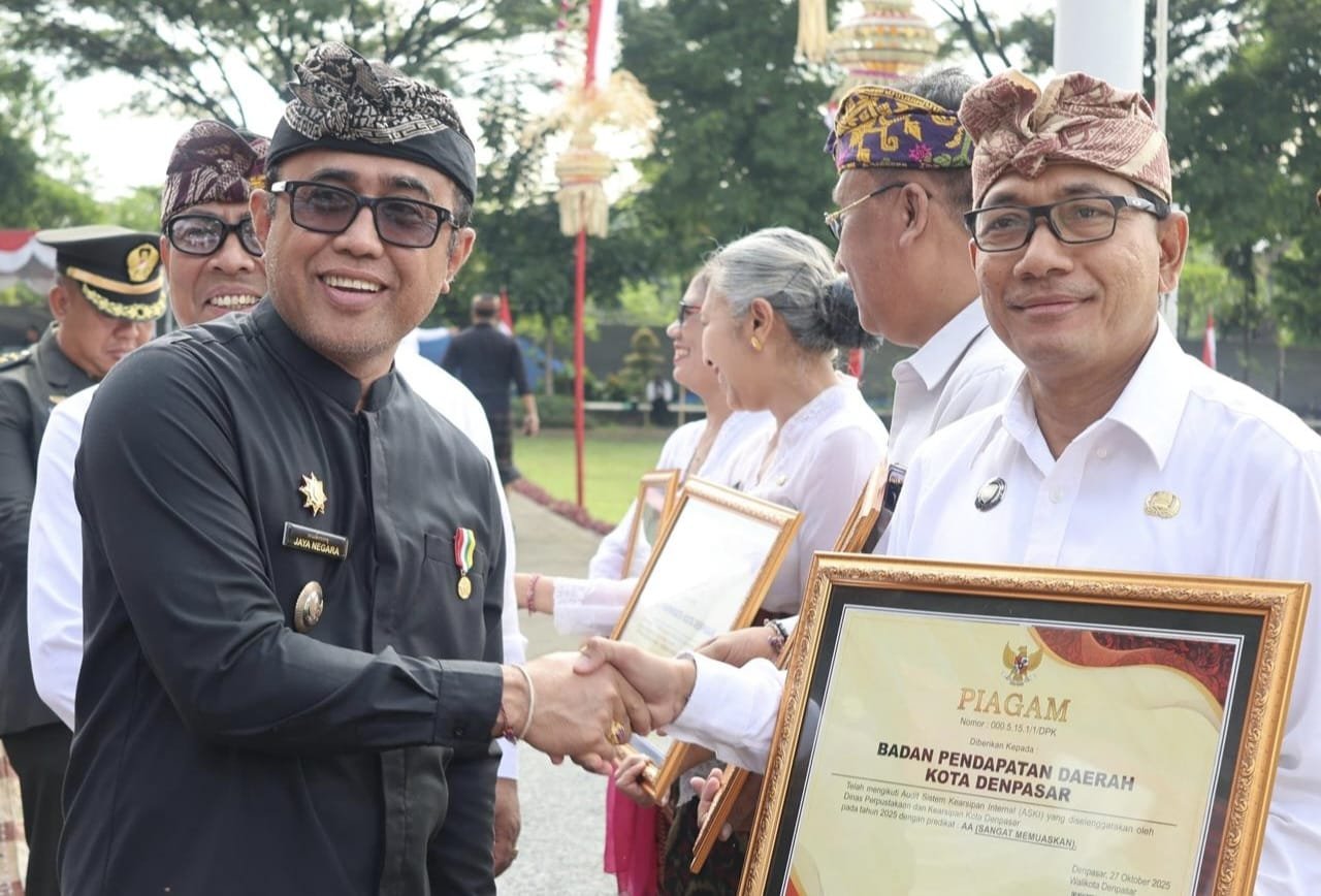 DENPASAR, MataDewata.com | Badan Pendapatan Daerah (Bapenda) Kota Denpasar kembali menorehkan prestasi gemilang dengan meraih penghargaan Audit Sistem Kearsipan Internal (ASKI) Tahun 2025. Penghargaan tersebut diserahkan langsung oleh Walikota Denpasar, I Gusti Ngurah Jaya Negara, kepada Kepala Bapenda Kota Denpasar, I Gusti Ngurah Eddy Mulya, usai Apel Peringatan Hari Pahlawan di Lapangan Lumintang Denpasar, Senin (10/11/2025).