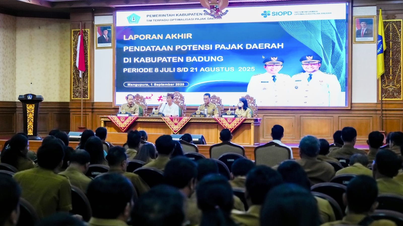 BADUNG, MataDewata.com | Pemkab Badung melaksanakan rapat finalisasi laporan akhir pendataan potensi pajak daerah di ruang Kertha Gosana, Puspem Badung, Senin (1/9/2025). Rapat dipimpin langsung Bupati Badung I Wayan Adi Arnawa didampingi Sekda Badung IB Surya Suamba selaku Ketua Tim Terpadu Optimalisasi Pajak Daerah (TOPD) dan diikuti Kadis Penanaman Modal dan Pelayanan Terpadu Satu Pintu (PMPTSP) I Made Agus Aryawan selaku Sekretaris I Tim TOPD, Kepala Bapenda Ni Putu Sukarini selaku Sekretaris II Tim TOPD, dari Kejari Badung sebagai anggota Tim serta Petugas Pendataan dari Perangkat Daerah dan Tim Teknis Sistem Informasi Optimalisasi Pajak Daerah (SIOPD).