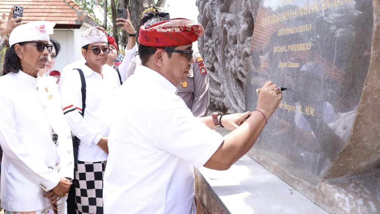 TABANAN, MataDewata.com | Sebagai bentuk dukungan pemerintah daerah terhadap pelestarian adat, budaya, serta penguatan sarana upacara keagamaan di wilayah Kabupaten Tabanan, Bupati Tabanan, Dr. I Komang Gede Sanjaya, S.E., M.M., menghadiri undangan ngupasaksi Upacara Pemelaspasan Gedung Graha Yadnya Sanjayaning Singasana Desa Adat Kota Tabanan, Selasa (13/1/2026). Bupati Sanjaya sekaligus meresmikan sebagai simbol dimulainya operasional Gedung Graha Yadnya yang berlokasi di Jln. Kresna No. 1 Tabanan yang ditandai dengan penandatanganan prasasti.