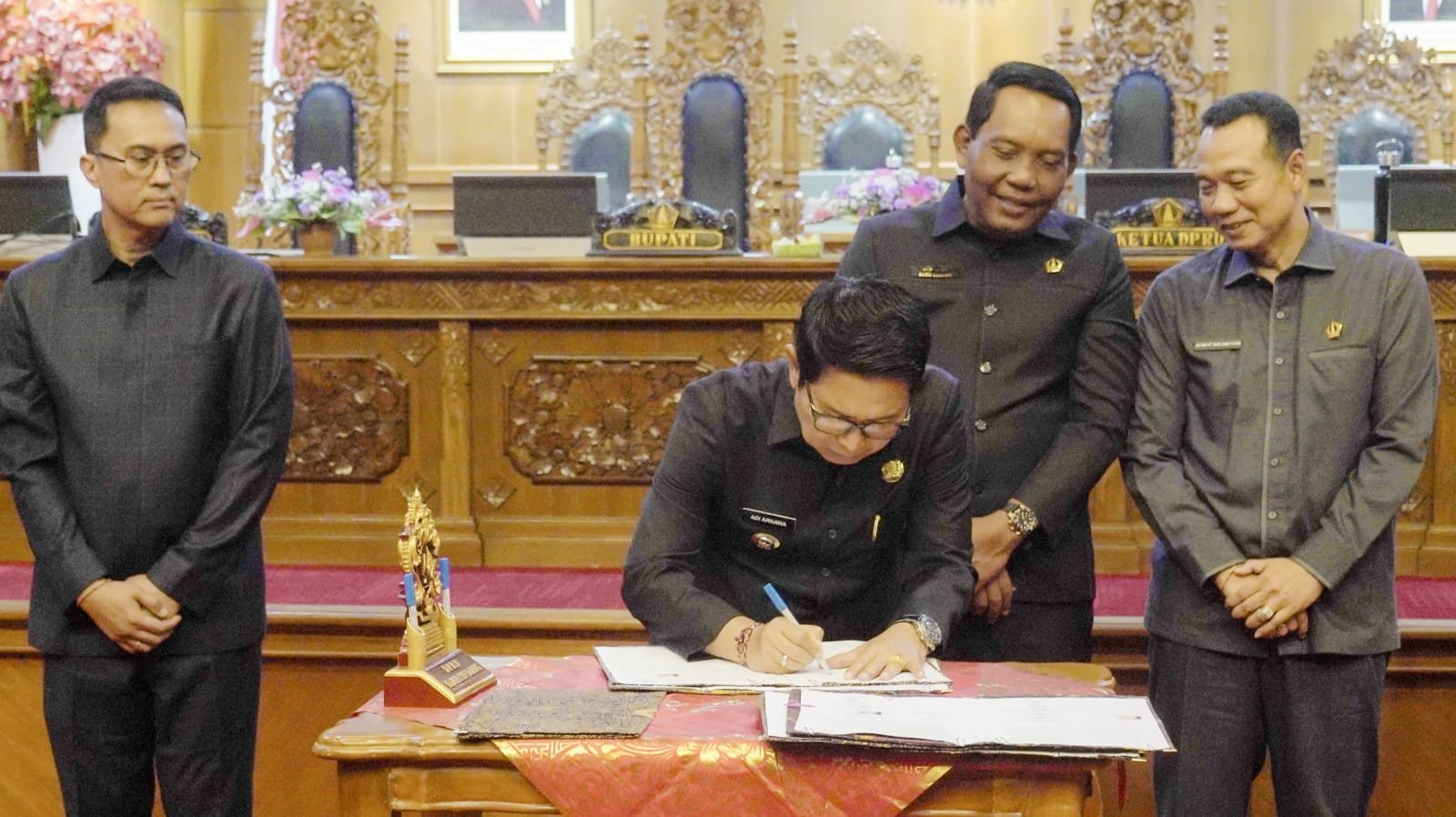 BADUNG, MataDewata.com | Pemkab Badung bersama DPRD Badung menyepakati dan menetapkan Raperda Perubahan APBD 2025 menjadi Perda serta Rancangan KUA dan PPAS Tahun Anggaran 2026. Kesepakatan tersebut dituangkan dalam penandatanganan surat keputusan DPRD Badung dan nota kesepakatan oleh Bupati Badung I Wayan Adi Arnawa bersama Ketua DPRD Badung I Gusti Anom Gumanti dan para Pimpinan DPRD pada Rapat Paripurna DPRD Badung di ruang Sidang Utama Gosana, Kantor DPRD Badung, Jumat (15/8/2025).