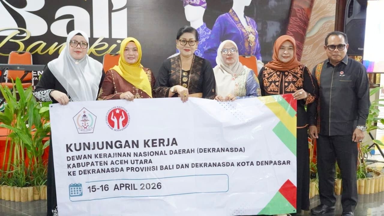 DENPASAR, MataDewata.com | Ketua Dewan Kerajinan Nasional Daerah (Dekranasda) Kabupaten Aceh Utara melaksanakan kunjungan kerja untuk menimba ilmu dari Provinsi Bali. Rombongan Dekranasda Aceh Utara yang dipimpin oleh Ny. Musliana Asmail diterima oleh Ketua Dekranasda Provinsi Bali, Ibu Putri Koster, di lokasi Pameran IKM Bali Bangkit, Taman Budaya Denpasar, Kamis (16/4/2026). Dalam kesempatan tersebut, Musliana memuji berbagai terobosan Ibu Putri Koster dalam mendorong kemajuan sektor kerajinan di Pulau Dewata.