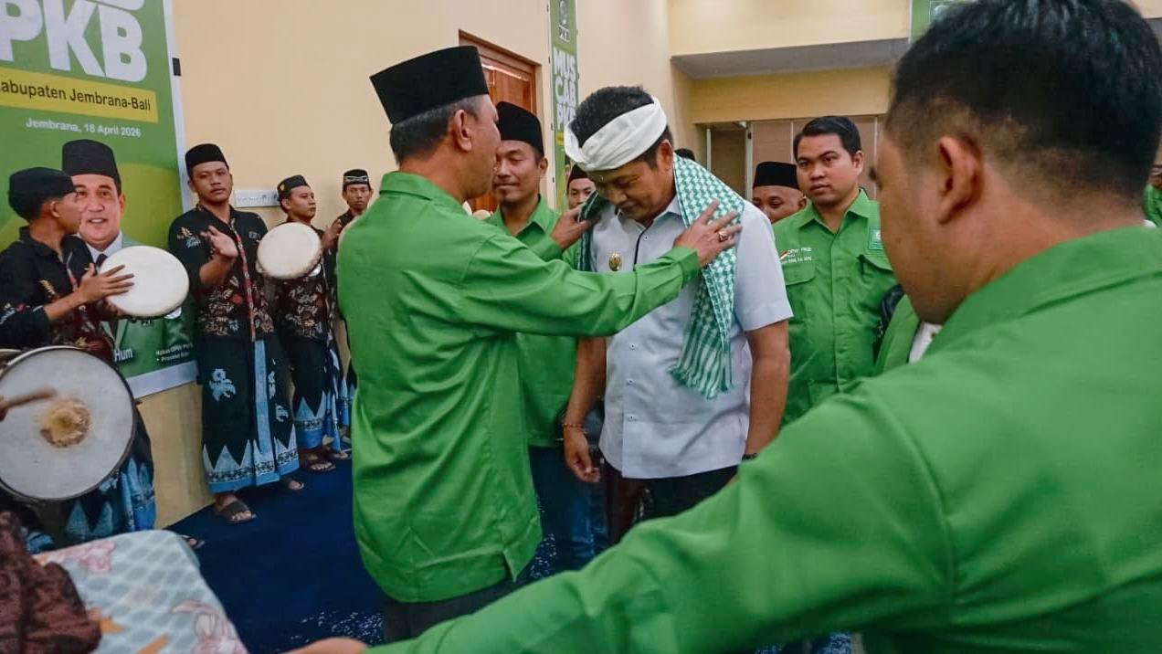 JEMBRANA, MataDewata.com | Bupati Jembrana, I Made Kembang Hartawan, menghadiri pembukaan Musyawarah Cabang (Muscab) Partai Kebangkitan Bangsa (PKB) Kabupaten Jembrana yang digelar di Ballroom Gedung Kesenian Ir. Soekarno, Sabtu (18/4/2026). Dalam momen tersebut, Bupati menegaskan pentingnya sinergi lintas partai demi kemajuan daerah.