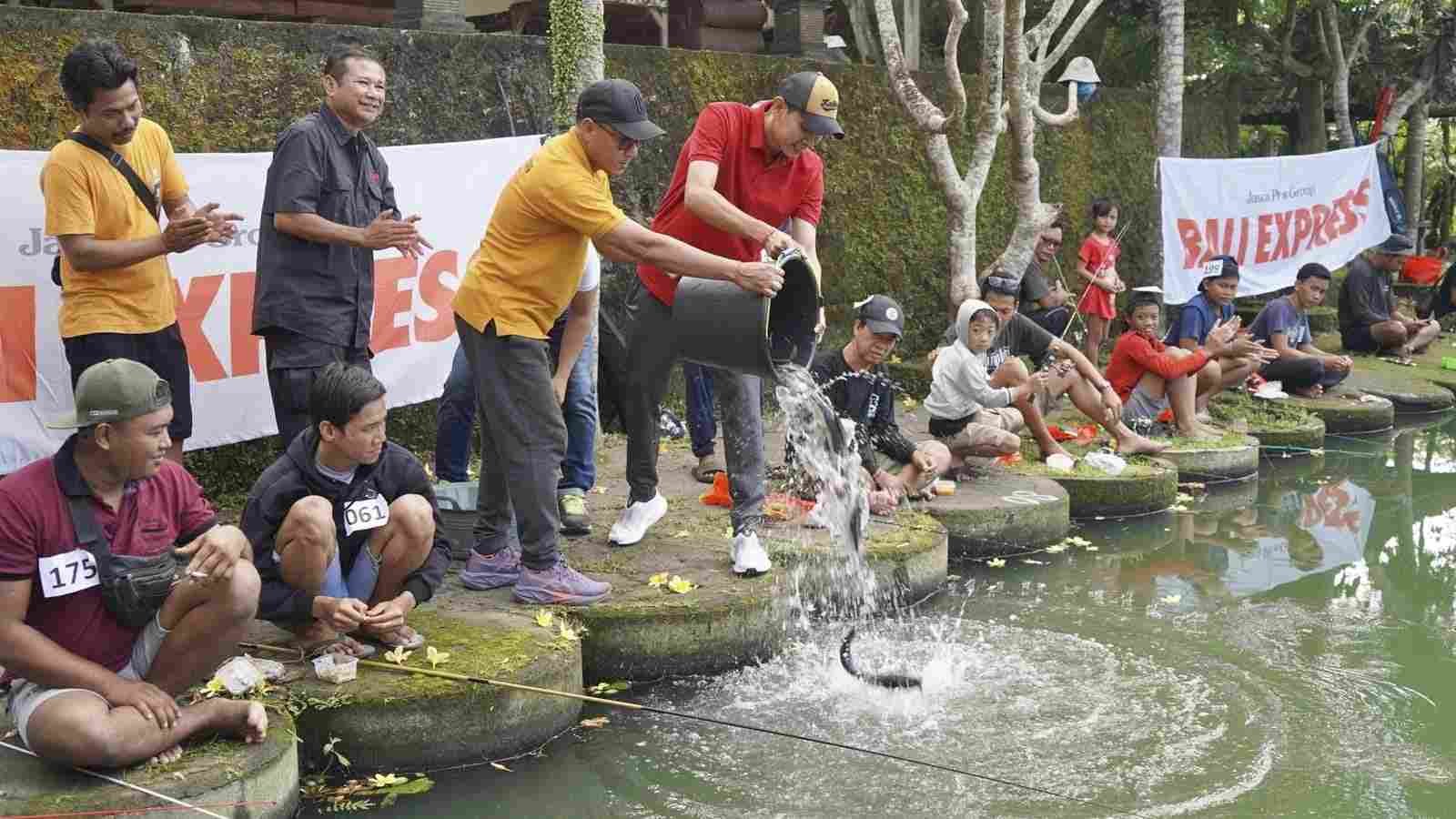 KLUNGKUNG, MataDewata.com | Wakil Bupati Klungkung, Tjokorda Gde Surya Putra bersama Anggota DPRD Klungkung, I Wayan Buda Parwata membuka Lomba Mancing Express di Kolam Pancing Nirmala Lepang, Kecamatan Banjarangkan, Minggu (21/9/2025).