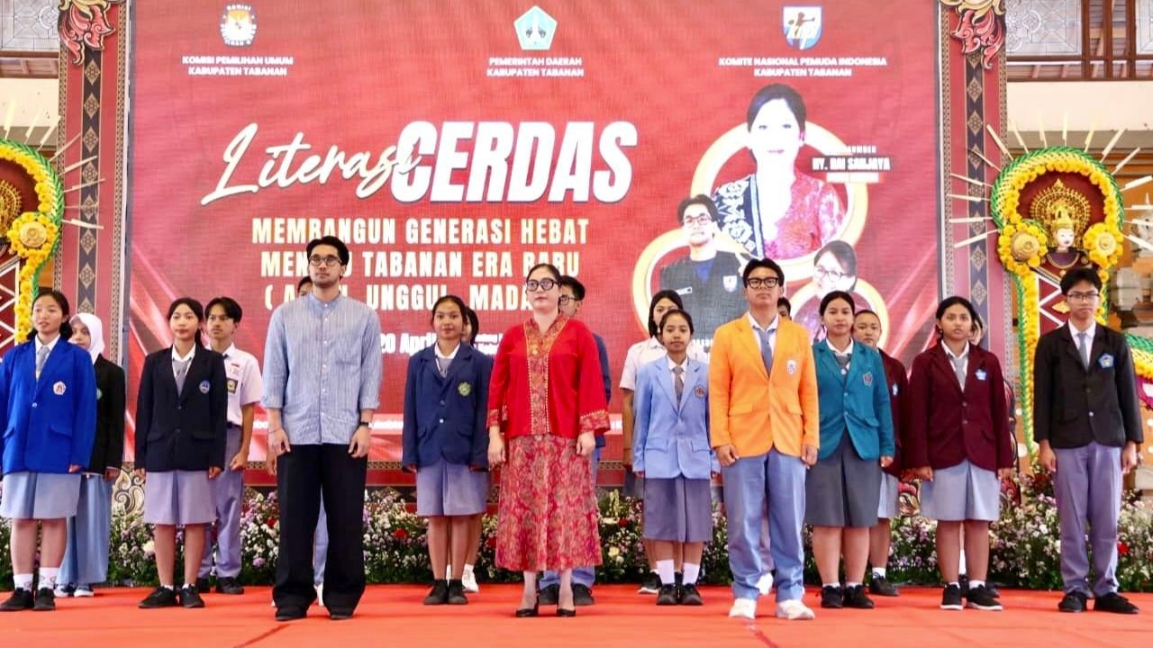 TABANAN, MataDewata.com | Ny. Rai Wahyuni Sanjaya atau yang akrab disapa Bunda Rai resmi mengemban tugas sebagai Bunda Literasi Kabupaten Tabanan periode 2026-2029. Pengukuhan tersebut dilaksanakan dalam rangkaian Festival Literasi di Gedung Kesenian I Ketut Marya Tabanan, Senin (20/4/2026), yang dipadati ratusan siswa dan guru. Prosesi pengukuhan dilakukan oleh Bupati Tabanan yang diwakili Wakil Bupati I Made Dirga, sekaligus menjadi penegasan komitmen daerah dalam membangun kualitas sumber daya manusia berbasis literasi.