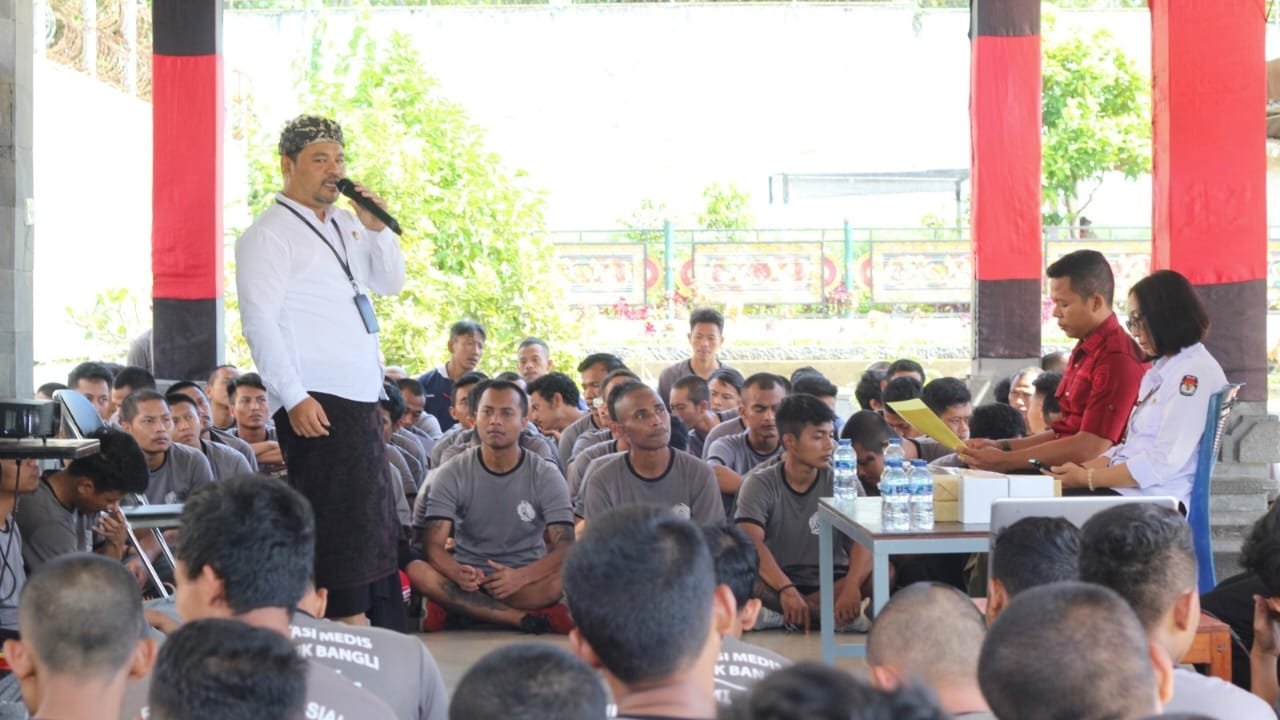 BANGLI, MataDewata.com | Lapas Narkotika Bangli, Kanwil Kemenkumham Bali bersama Komisi Pemilihan Umum Daerah (KPUD) Bangli melakukan sosialisasi tentang Pemilihan Umum 2024 yang menyasar para Warga Binaan Pemasyarakatan (WBP) pada Tempat Pemungutan Suara (TPS) Khusus di Lapas Nakotika Kelas IIA Bangli pada Kamis, (1/2/2024). Hadir memberikan materi, Ketua Divisi Sosialisasi, Pendidikan Pemilih, Partisipasi Masyarakat dan SDM KPUD Bangli, I Made Surya Dharma Yudha.