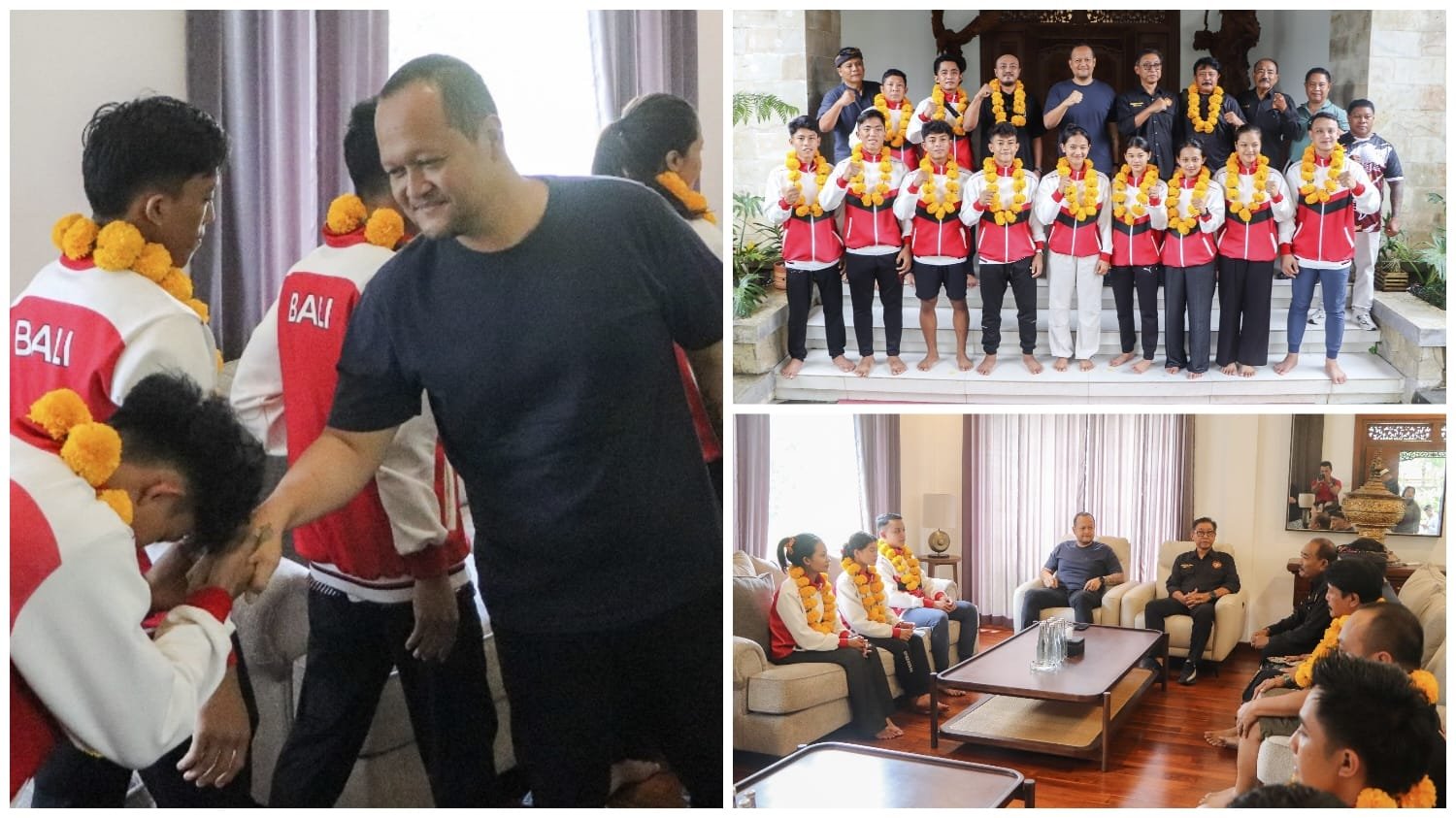 BADUNG, MataDewata.com | Wakil Bupati Badung, Bagus Alit Sucipta yang juga Penasehat IPSI Bali menyambut kedatangan para atlet Pekan Olahraga Nasional (PON) Bela Diri yang tergabung dalam Ikatan Pencak Silat Indonesia (IPSI) Provinsi Bali. Penyambutan berlangsung di Ruang Tamu Rumah Jabatan Wakil Bupati Badung, Kamis (23/10/2025). Dalam kesempatan tersebut, Wabup Bagus Alit Sucipta mengalungkan bunga kepada para atlet sebagai bentuk penghargaan atas perjuangan dan prestasi yang telah diraih dalam ajang bergengsi nasional di Kudus, Jawa Tengah.