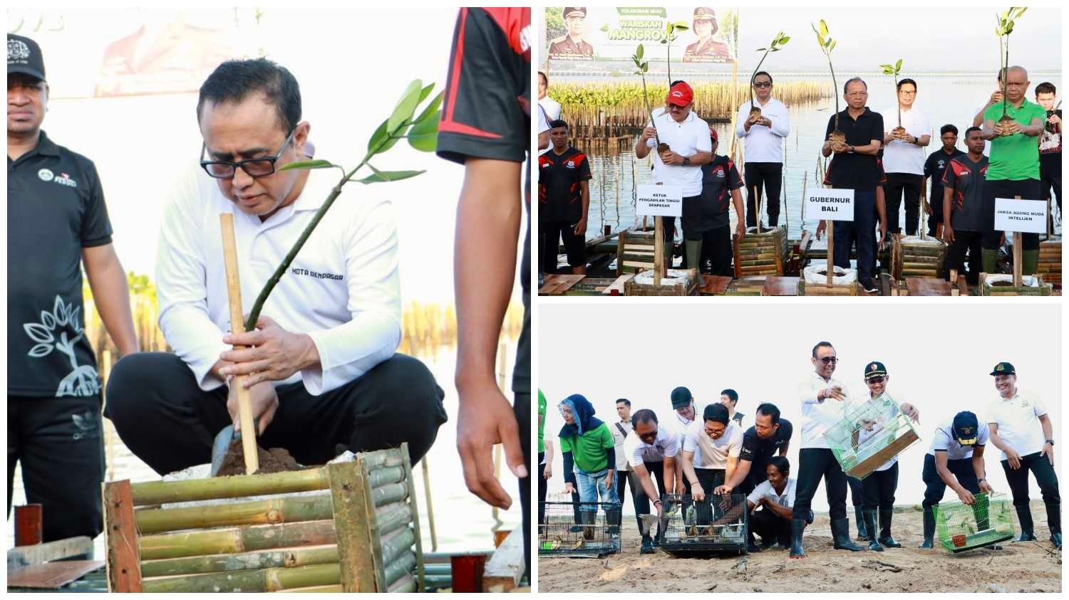 DENPASAR, MataDewata.com | Kegiatan sinergi lintas sektor dalam menjaga ekosistem pesisir Bali kembali ditegaskan melalui aksi nyata. Walikota Denpasar, I Gusti Ngurah Jaya Negara bersama Kepala Kejaksaan Tinggi (Kajati) Bali, Dr. Chatarina Muliana, Gubernur Bali, Wayan Koster dan Bupati Badung I Wayan Adi Arnawa mengikuti aksi penanaman mangrove dan pelepasan burung di kawasan Taman Hutan Raya Ngurah Rai, Sabtu (25/4/2026).