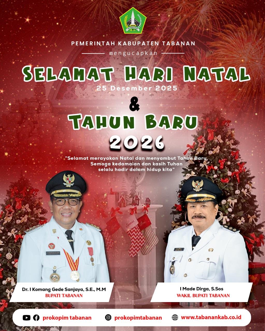 TABANAN, MataDewata.com | Bupati Tabanan Dr. I Komang Gede Sanjaya.,S.E.,M.M., bersama Jajaran Forkopimda Kabupaten Tabanan beserta jajaran Pemerintah Kabupaten Tabanan menyampaikan ucapan selamat merayakan hari suci Natal tahun 2025 kepada umat Kristiani serta menyambut Tahun Baru 2026 kepada seluruh masyarakat. Disampaikan sebagai bentuk perhatian dan kebersamaan pemerintah daerah kepada seluruh elemen masyarakat, sekaligus memperkuat semangat toleransi, persaudaraan, dan harmoni dalam kehidupan bermasyarakat di Tabanan.