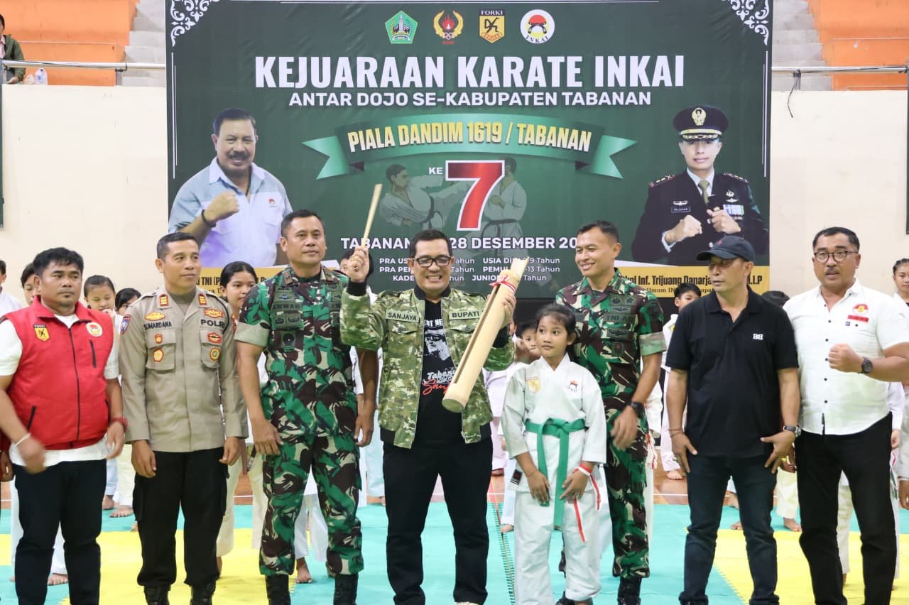 TABANAN, MataDewata.com | Bupati Tabanan, Dr. I Komang Gede Sanjaya.,S.E.,M.M, membuka secara resmi Kejuaraan Karate INKAI Antar Dojo se-Kabupaten Tabanan yang memperebutkan piala Komandan Kodim 1619/Tabanan (DANDIM CUP VII 2025). Kejuaraan ini menjadi penutup rangkaian kegiatan olahraga prestasi di penghujung tahun 2025 dan dilaksanakan di GOR Debes Utara, Gerokgak, Tabanan, Sabtu (27/12/2025), dengan mempertandingkan kategori kata perorangan dan kumite perorangan yang berlangsung selama dua hari, yakni 27-28 Desember 2025.