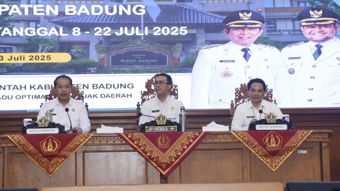 BADUNG, MataDewata.com | Menindaklanjuti keputusan Bupati Badung Nomor: 258/052/HK/2025 tentang Pembentukan Tim Terpadu Optimalisasi Pajak Daerah Dalam Rangka Optimalisasi Pendapatan Asli Daerah (PAD), Pemkab Badung Melalui Dinas Penanaman Modal dan Pelayanan Terpadu Satu Pintu (DPMPTSP) kembali melaksanakan rapat evaluasi pendataan potensi pajak daerah yang dipimpin Sekretaris Daerah Kabupaten Badung lB. Surya Suamba bertempat di Ruang Kertha Gosana Puspem Badung, Rabu (23/7/2025). Turut hadir pimpinan OPD terkait di lingkup Pemkab Badung dan staf teknis.