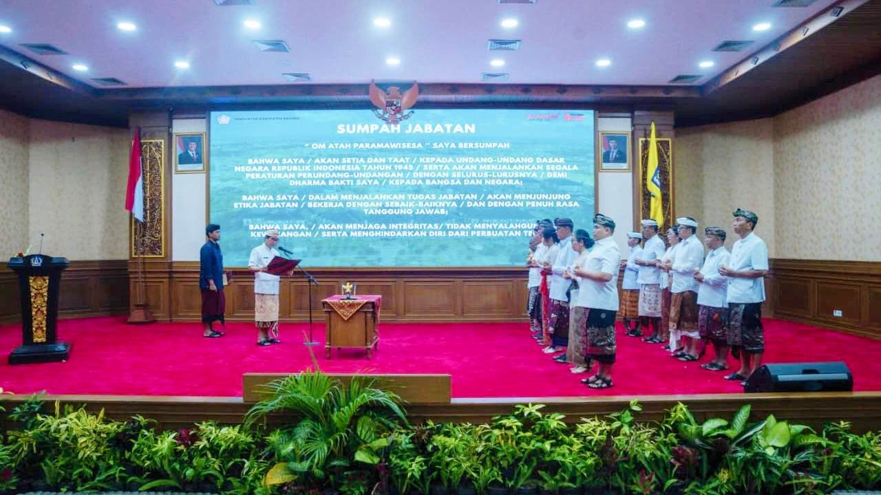 BADUNG, MataDewata.com | Bupati Badung, I Wayan Adi Arnawa, secara resmi melantik dan mengambil sumpah jabatan 12 Pejabat Pimpinan Tinggi Pratama di Lingkungan Pemerintah Kabupaten Badung yang berlangsung di Ruang Kertha Gosana, Puspem Badung, Kamis (30/4). Pejabat yang terpilih telah melalui proses seleksi objektif dan transparan berbasis sistem merit serta manajemen talenta untuk memastikan kompetensi yang sesuai. Acara pelantikan ini turut dihadiri oleh Ketua DPRD Badung I Gusti Anom Gumanti, Sekda Badung IB Surya Suamba, serta pimpinan perangkat daerah lainnya.