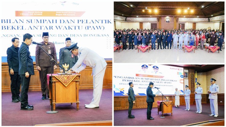BADUNG, MataDewata.com | Bupati Badung, I Wayan Adi Arnawa melantik Perbekel Antar Waktu (PAW) diantaranya Perbekel Desa Pangsan Kecamatan Petang, Perbekel Desa Sedang dan Perbekel Desa Bongkasa Kecamatan Abiansemal bertempat di Ruang Kertha Gosana Puspem Badung, Selasa (31/3/2026). Turut hadir Ketua DPRD Badung I Gst. Anom Gumanti bersama Wakil Ketua Komisi I I Gst Lanang Umbara, Para pejabat terkait dilingkungan Pemkab Badung, para Camat se-Badung, Organisasi Kewanitaan, Ketua BPD, LPM serta para Perbekel dan Ketua TP. PKK se-Badung.