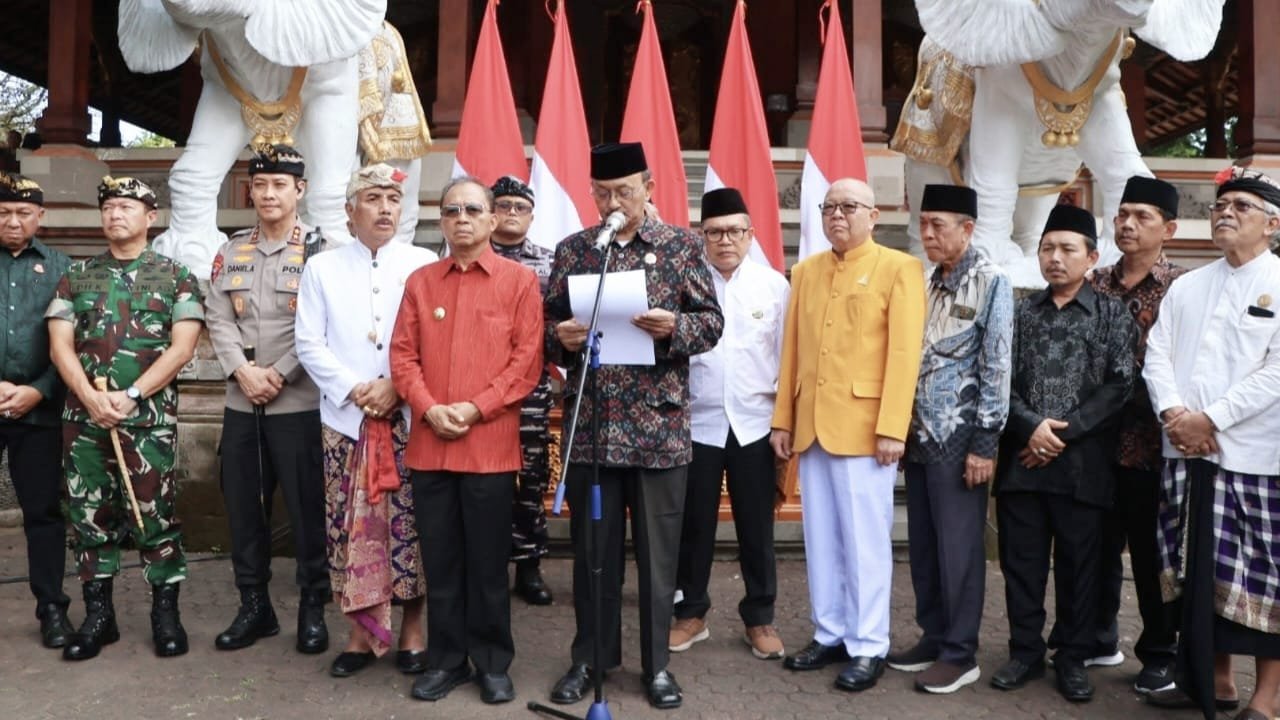 DENPASAR, MataDewata.com | Gubernur Bali, Wayan Koster menggelar dialog dan konferensi pers bersama pemuka agama se-Bali yang dihadiri oleh Pangdam IX/Udayana, Kajati Bali, Ketua DPRD Provinsi Bali, Danlanal, Danlanud, Danrem, Majelis Desa Adat Provinsi Bali serta majelis umat beragama dari Islam, Kristen, Hindu, Buddha, dan Konghucu, termasuk perwakilan majelis desa adat se-Kabupaten/Kota di Bali, yang berlangsung di Gedung Kertha Sabha, Denpasar pada Minggu (31/8/2025).